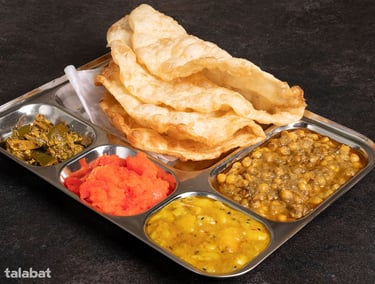 A classic breakfast combo — fluffy puris, sweet halwa, and savory chana, just like home.